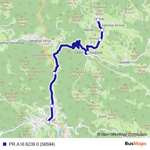 The first stop of the PR A18 6239 0 (58594) bus route is Ledine and the last stop is Idrija. PR A18 6239 0 (58594) (PR A18 6239 0 (58594)) is operational during on weekdays.