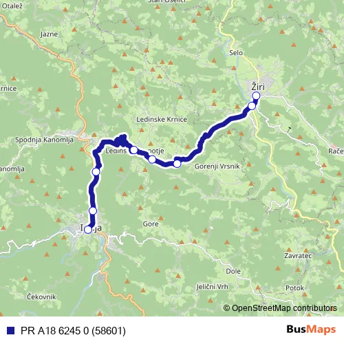 The first stop of the PR A18 6245 0 (58601) bus route is Idrija and the last stop is Žiri Dom. PR A18 6245 0 (58601) (PR A18 6245 0 (58601)) is operational during on weekdays.