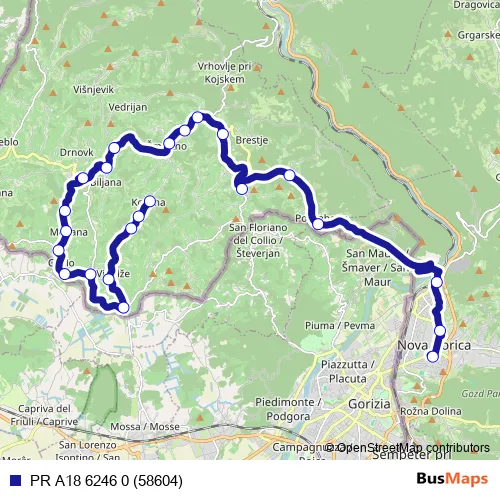 The first stop of the PR A18 6246 0 (58604) bus route is Kozana and the last stop is Nova Gorica Ap. PR A18 6246 0 (58604) (PR A18 6246 0 (58604)) is operational during on weekdays.