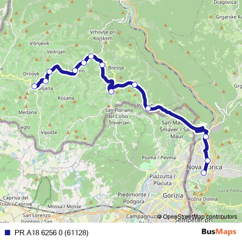 The first stop of the PR A18 6256 0 (61128) bus route is Nova Gorica Ap and the last stop is
