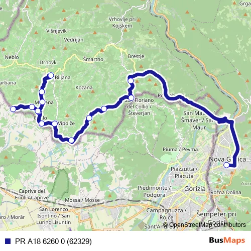 The first stop of the PR A18 6260 0 (62329) bus route is Nova Gorica Ap and the last stop is Dobrovo Š. PR A18 6260 0 (62329) (PR A18 6260 0 (62329)) is operational during on weekdays.