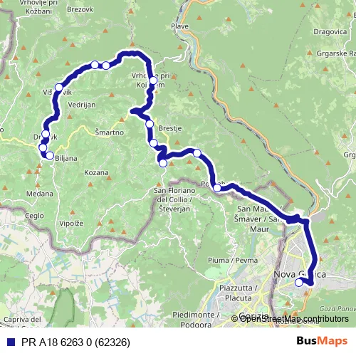 The first stop of the PR A18 6263 0 (62326) bus route is Nova Gorica Ap and the last stop is Dobrovo Š. PR A18 6263 0 (62326) (PR A18 6263 0 (62326)) is operational during on weekdays.