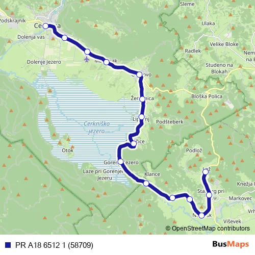 The first stop of the PR A18 6512 1 (58709) bus route is Cerknica and the last stop is