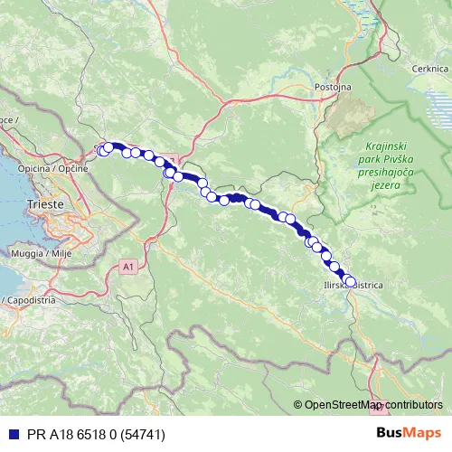 The first stop of the PR A18 6518 0 (54741) bus route is Sežana and the last stop is