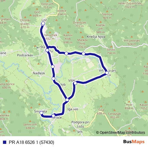 The first stop of the PR A18 6526 1 (57430) bus route is Lož and the last stop is