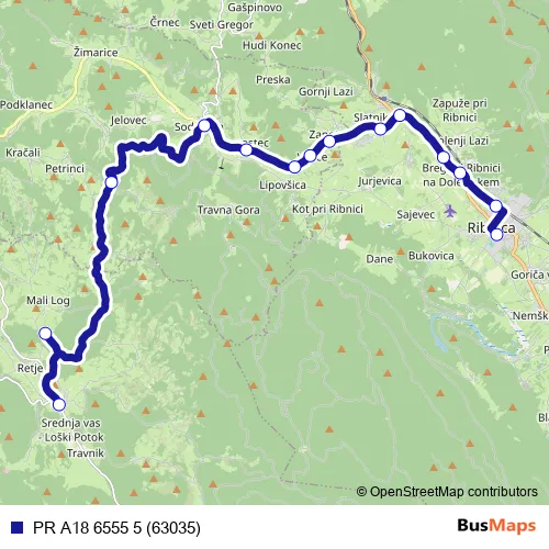 The first stop of the PR A18 6555 5 (63035) bus route is Hrib-Loški Potok and the last stop is