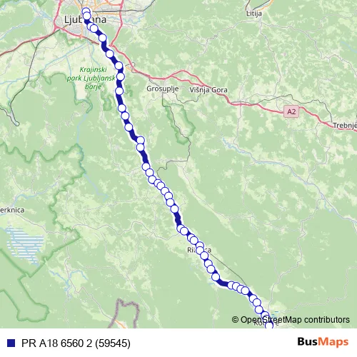 The first stop of the PR A18 6560 2 (59545) bus route is Ljubljana Ap and the last stop is Kočevje. PR A18 6560 2 (59545) (PR A18 6560 2 (59545)) is operational during everyday.