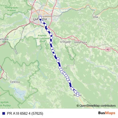The first stop of the PR A18 6562 4 (57625) bus route is Ljubljana Ap and the last stop is
