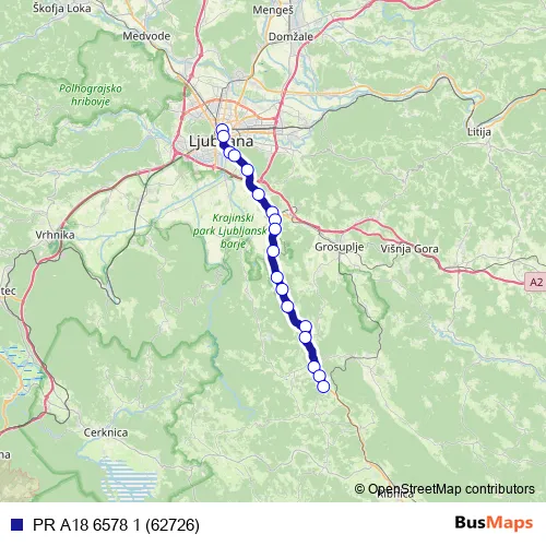 The first stop of the PR A18 6578 1 (62726) bus route is Ljubljana Ap and the last stop is V.Lašče. PR A18 6578 1 (62726) (PR A18 6578 1 (62726)) is operational during on weekdays.