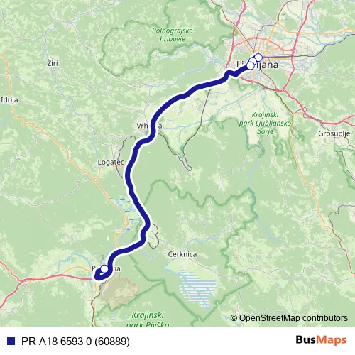 The first stop of the PR A18 6593 0 (60889) bus route is Ljubljana Ap and the last stop is