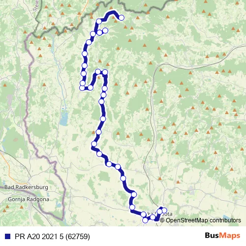 The first stop of the PR A20 2021 5 (62759) bus route is Murska Sobota Ekonom. Š and the last stop is