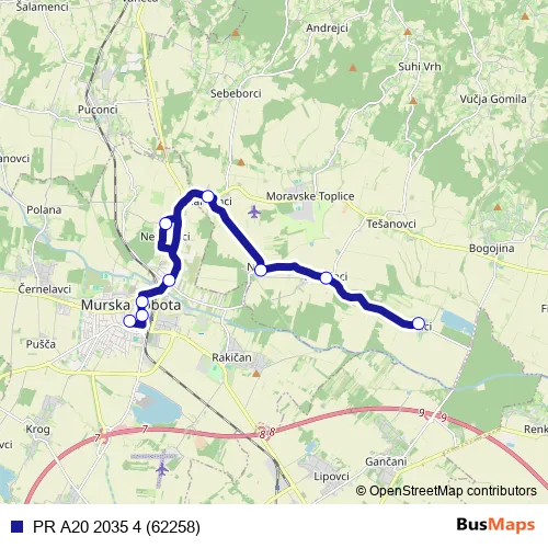 The first stop of the PR A20 2035 4 (62258) bus route is Murska Sobota Ap and the last stop is Ivanci Gd. PR A20 2035 4 (62258) (PR A20 2035 4 (62258)) is operational during on weekdays.
