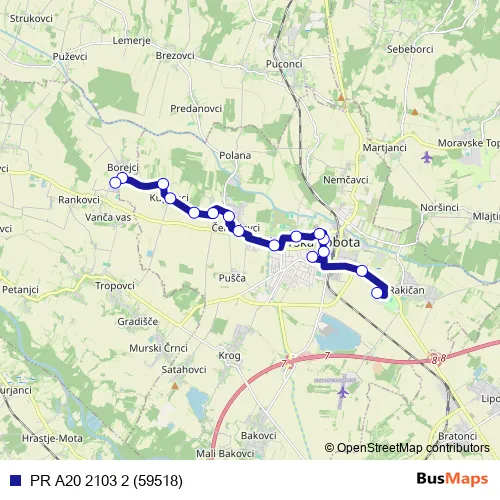 The first stop of the PR A20 2103 2 (59518) bus route is Rakičan bol. and the last stop is Vanča vas Jaušovo. PR A20 2103 2 (59518) (PR A20 2103 2 (59518)) is operational during on weekdays.