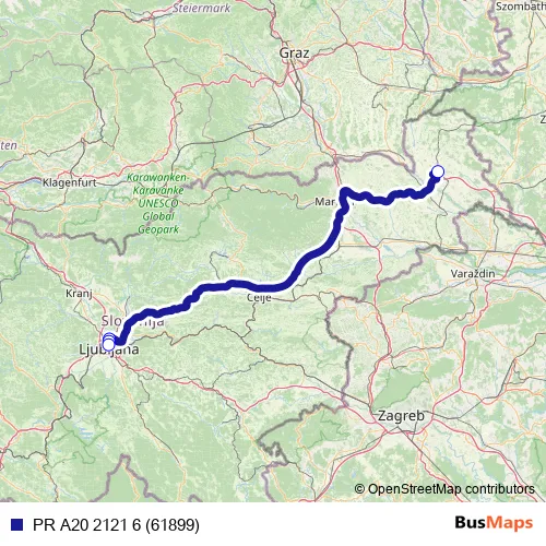 The first stop of the PR A20 2121 6 (61899) bus route is Murska Sobota Ap and the last stop is Ljubljana Ap. PR A20 2121 6 (61899) (PR A20 2121 6 (61899)) is operational during everyday.
