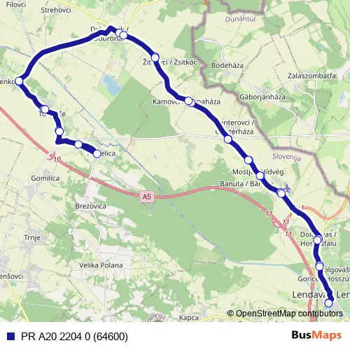 The first stop of the PR A20 2204 0 (64600) bus route is Lendava and the last stop is