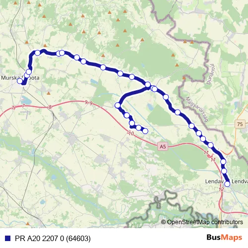 The first stop of the PR A20 2207 0 (64603) bus route is Murska Sobota Ap and the last stop is Lendava. PR A20 2207 0 (64603) (PR A20 2207 0 (64603)) is operational during on weekdays.