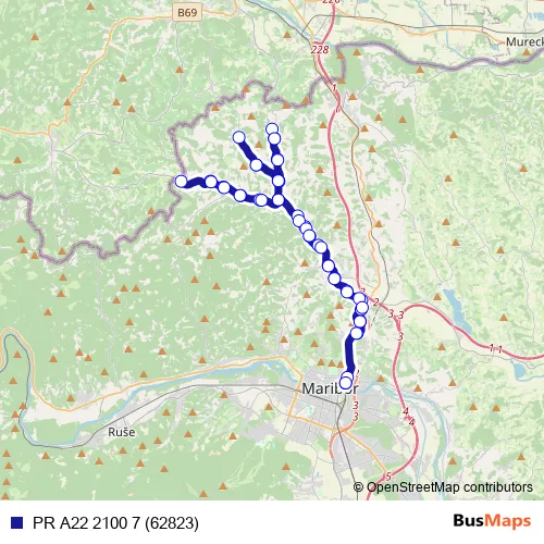 The first stop of the PR A22 2100 7 (62823) bus route is Maribor Ap and the last stop is