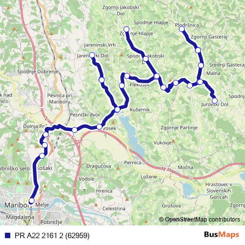 The first stop of the PR A22 2161 2 (62959) bus route is Maribor Ap and the last stop is