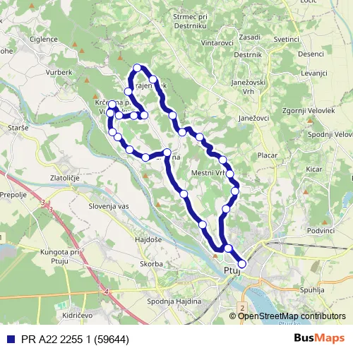 The first stop of the PR A22 2255 1 (59644) bus route is Ptuj Ap and the last stop is