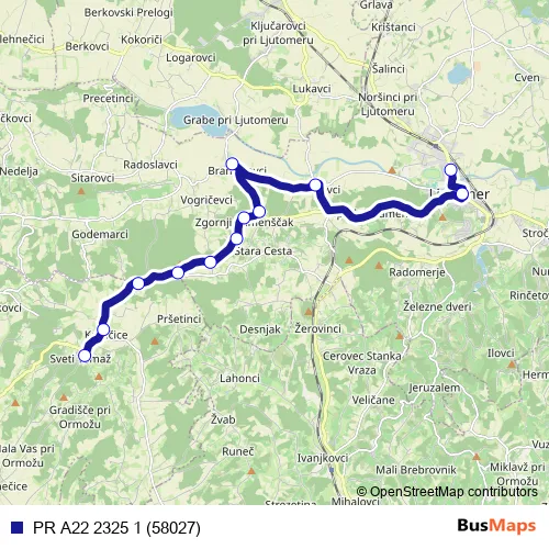 The first stop of the PR A22 2325 1 (58027) bus route is Sv.Tomaž and the last stop is