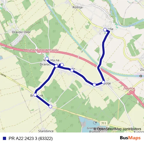 The first stop of the PR A22 2423 3 (63322) bus route is Starše and the last stop is
