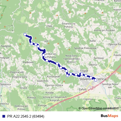 The first stop of the PR A22 2545 2 (63494) bus route is Sl.Bistrica and the last stop is