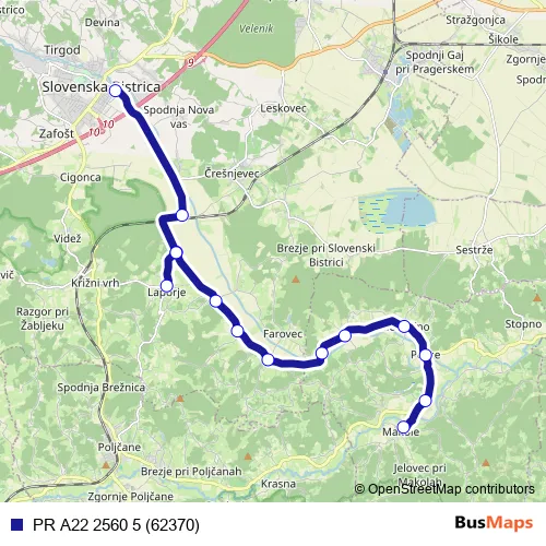 The first stop of the PR A22 2560 5 (62370) bus route is Sl.Bistrica and the last stop is