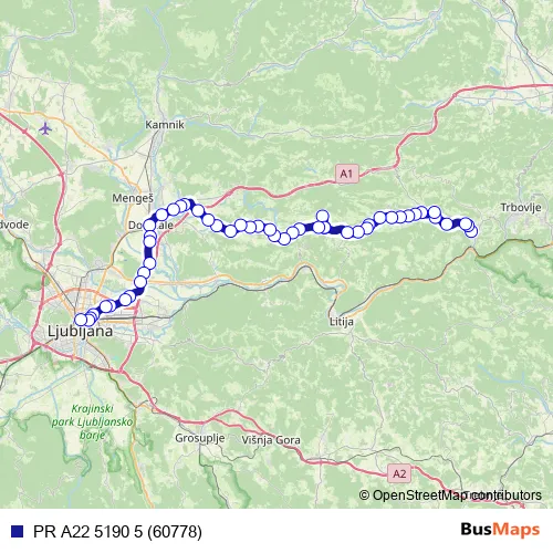The first stop of the PR A22 5190 5 (60778) bus route is Zagorje ob S. and the last stop is