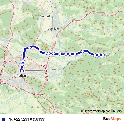The first stop of the PR A22 5231 0 (58133) bus route is Senožeti/Litiji K and the last stop is