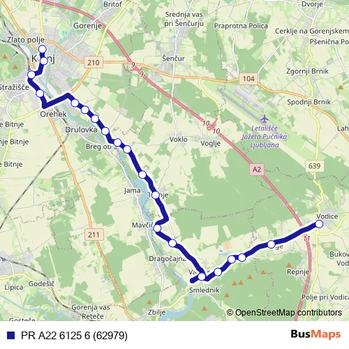 The first stop of the PR A22 6125 6 (62979) bus route is Kranj Ap and the last stop is