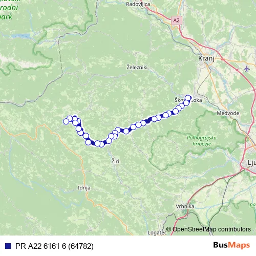 The first stop of the PR A22 6161 6 (64782) bus route is Škofja Loka and the last stop is