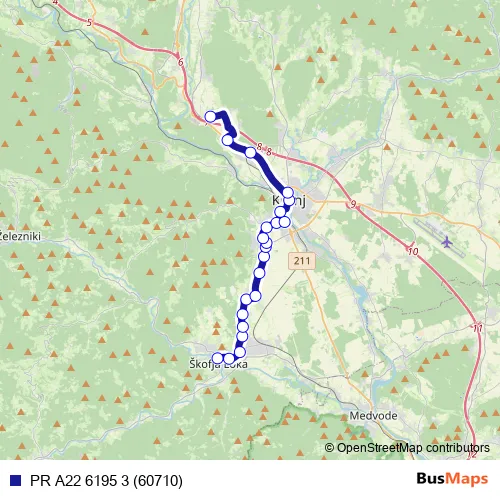 The first stop of the PR A22 6195 3 (60710) bus route is Škofja Loka and the last stop is Strahinj posestvo. PR A22 6195 3 (60710) (PR A22 6195 3 (60710)) is operational during on weekdays.
