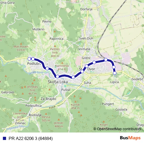 The first stop of the PR A22 6206 3 (64884) bus route is Škofja Loka Lipica and the last stop is