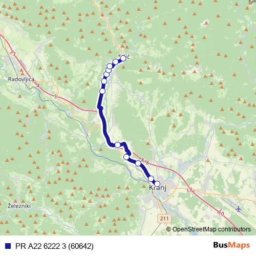 The first stop of the PR A22 6222 3 (60642) bus route is Kranj Ap and the last stop is Tržič. PR A22 6222 3 (60642) (PR A22 6222 3 (60642)) is operational during on weekdays.