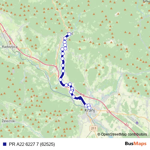 The first stop of the PR A22 6227 7 (62525) bus route is Tržič and the last stop is