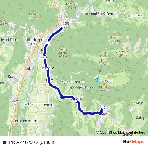 The first stop of the PR A22 6250 2 (61008) bus route is Tržič and the last stop is Golnik. PR A22 6250 2 (61008) (PR A22 6250 2 (61008)) is operational during on weekdays.