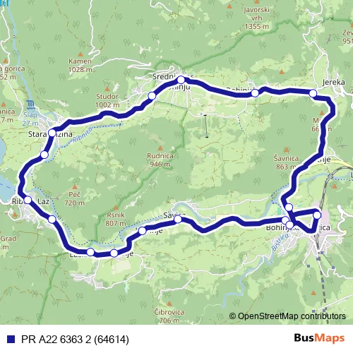 The first stop of the PR A22 6363 2 (64614) bus route is Bohinjska Bistrica ŽP/Rs and the last stop is Bohinjska Bistrica ŽP/Rs. PR A22 6363 2 (64614) (PR A22 6363 2 (64614)) is operational during on weekdays.