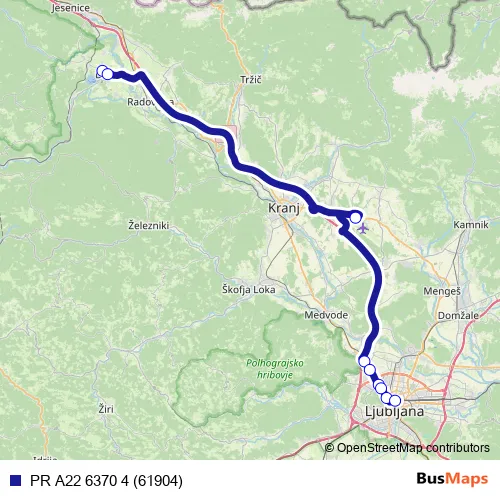 The first stop of the PR A22 6370 4 (61904) bus route is Bled and the last stop is