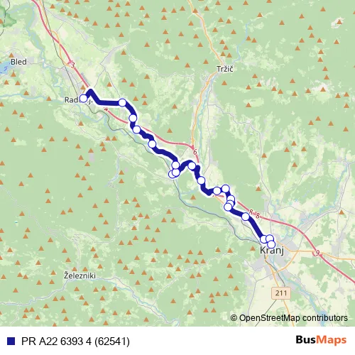 The first stop of the PR A22 6393 4 (62541) bus route is Radovljica and the last stop is