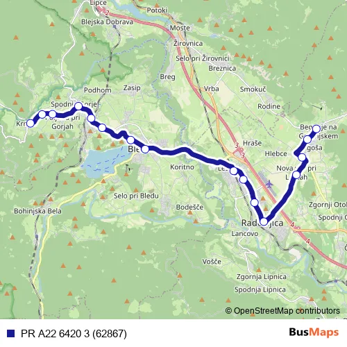 The first stop of the PR A22 6420 3 (62867) bus route is Krnica and the last stop is Begunje na Gor.. PR A22 6420 3 (62867) (PR A22 6420 3 (62867)) is operational during everyday.