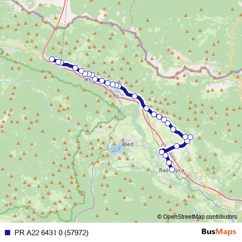 The first stop of the PR A22 6431 0 (57972) bus route is Radovljica and the last stop is