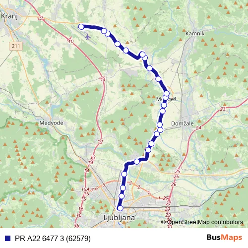 The first stop of the PR A22 6477 3 (62579) bus route is Ljubljana Ap and the last stop is Brnik/airport Ljubljana. PR A22 6477 3 (62579) (PR A22 6477 3 (62579)) is operational during on weekdays.