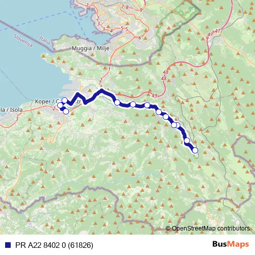 The first stop of the PR A22 8402 0 (61826) bus route is Dol pri Hrastovljah and the last stop is Koper. PR A22 8402 0 (61826) (PR A22 8402 0 (61826)) is operational during on weekdays.