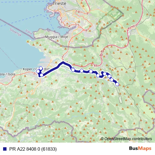 The first stop of the PR A22 8408 0 (61833) bus route is Koper and the last stop is