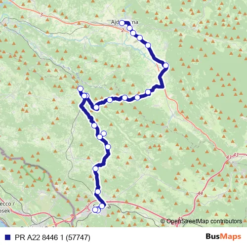 The first stop of the PR A22 8446 1 (57747) bus route is Ajdovščina and the last stop is