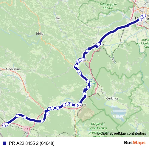 The first stop of the PR A22 8455 2 (64648) bus route is Sežana and the last stop is