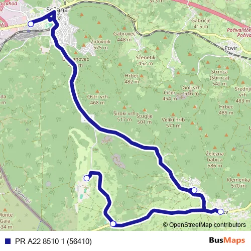 The first stop of the PR A22 8510 1 (56410) bus route is Sežana and the last stop is