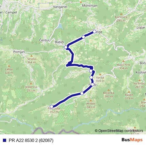 The first stop of the PR A22 8530 2 (62087) bus route is Marezige and the last stop is Labor. PR A22 8530 2 (62087) (PR A22 8530 2 (62087)) is operational during on weekdays.