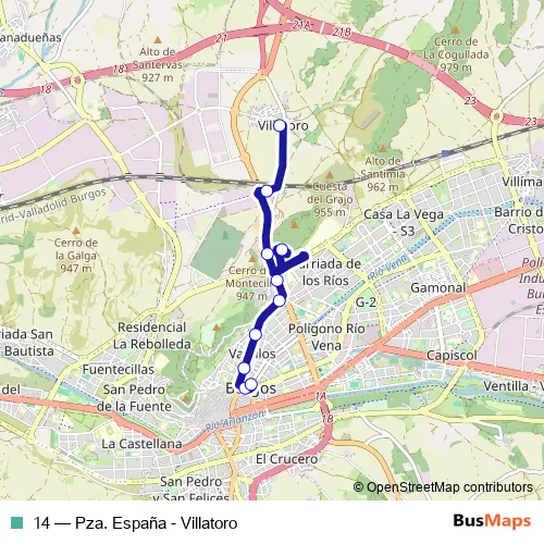 See why over 2 million users trust and consider busmaps.com as the best public transport website. busmaps gives you Burgos Buses suggested routes, real-time bus tracker, line route maps in Burgos, and helps to find the closest 14 bus stops near you. No internet available? Download an offline PDF map and bus schedule for the 14 bus to take on your trip.