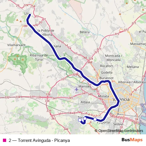 The first stop of the 2 metro route is Torrent Avinguda and the last stop is Picanya. 2 (Torrent Avinguda - Picanya) is operational during everyday.